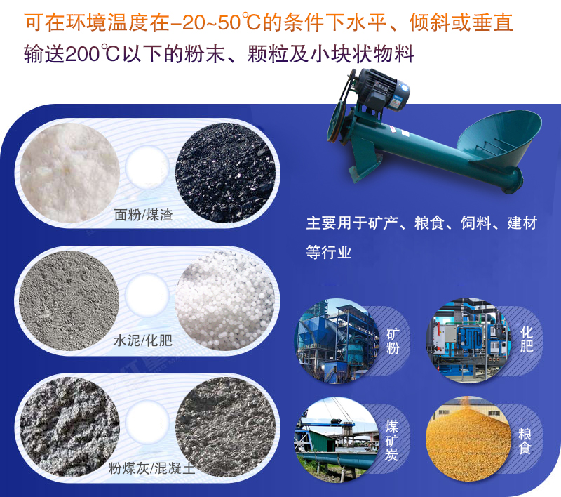 螺旋給料機主要用于礦產、糧食、飼料、建材等行業,可在環境溫度在-20~50℃的條件下水平、傾斜或垂直輸送200℃以下的粉末、顆粒及小塊狀物料,如:面粉、煤渣、粉煤灰、化肥、水泥、混凝土等物料。