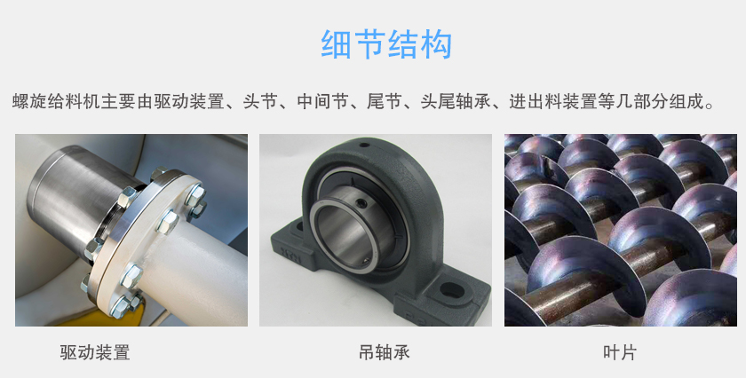 螺旋給料機主要由驅動裝置、頭節、中間節、尾節、頭尾軸承、進出料裝置等幾部分組成。